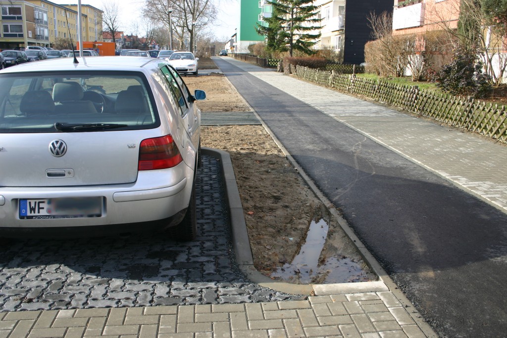 Diesen Restflächetyp kennen Sie nun schon. Es gibt ihn im bisher fertig gestellten Teil der EMA zwölf mal. Zusammen mit der Fläche, die im nächsten Bild gezeigt wird, hätte das jeweils einen Parkplatz gegeben, wäre billiger zu bauen gewesen und hätte keine Kosten für Grünflächenpflege nach sich gezogen.