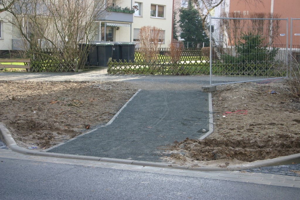 Betonsteine für die Restflächen waren genug da, aber für Fußgänger reicht eine bei Regen und im Winter matschige "wassergebundene" Decke.