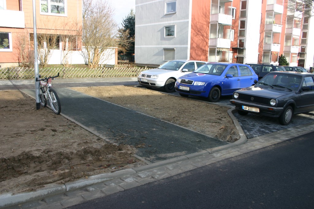 Das komplette Spektrum in einem Bild: Hinten die Rest-Grünfläche, zwischen den vorderen Autos die Betonrestfläche, eine überflüssige Ausrundung der Parkbucht (weil es ja sowieso eine "Parktasche" gibt) und die "wassergebundene" Decke für Fußgänger.