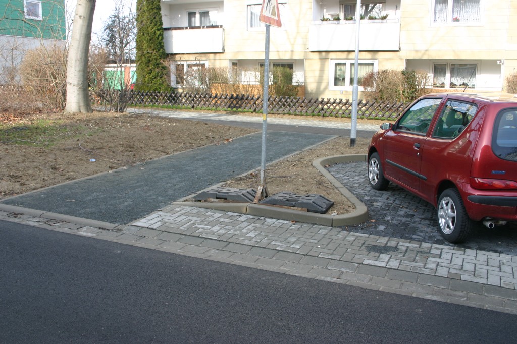 Am Ende der Fläche zum Schrägparken auf der Nordseite. Wer tatsächlich hinter den Fahrzeugen auf der hellgrauene Fläche an der Straße entlangläuft wird durch einen wassergundenen Weg dafür belohnt, dass er nicht gleich über die Grünfläche gelaufen ist. Die nasenförmige Rest-Grünfläche bedarf keines Kommentars.