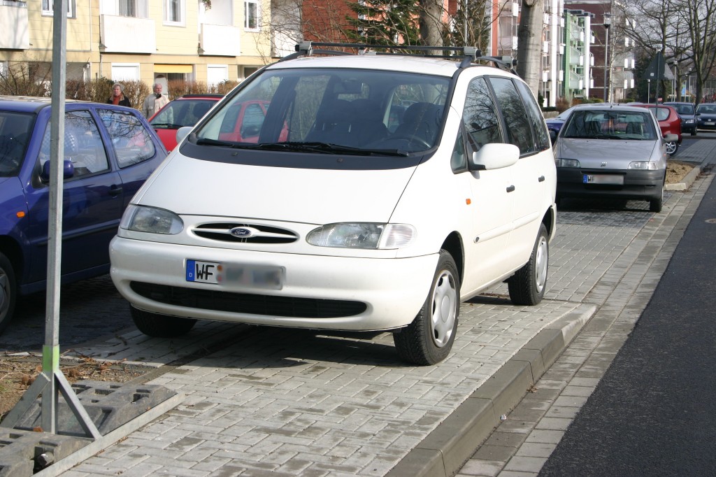 Eigentlich ist das der Fußweg zur Bushaltestelle. Der Fahrer dieses Fahrzeug sieht das anders. - Ohne ihn in Schutz nehmen zu wollen: Der busfahrende Mensch kommt tatsächlich nicht unbedingt über den Parkplatz. - Unter dem linken Vorderrad auch gut erkennen ist die Beton-Restfläche mit extra(-teurem) eingelassenen Bord.
